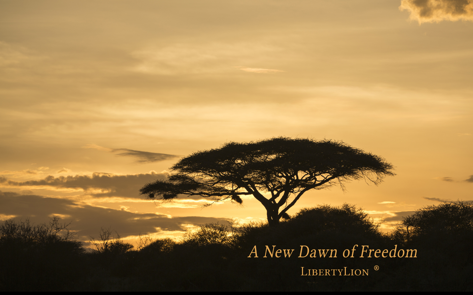 "A New Dawn of Freedom", featured on LibertyLion®'s home page, is a beautiful dawn in Africa. It was taken by Sarah Clark, a professional photographer. She has kindly allowed us to distribute her picture as LibertyLion® computer desktop wallpaper along with a high resolution version suitable for large format printing and framing so you can hang it on your wall to show your support of Freedom.